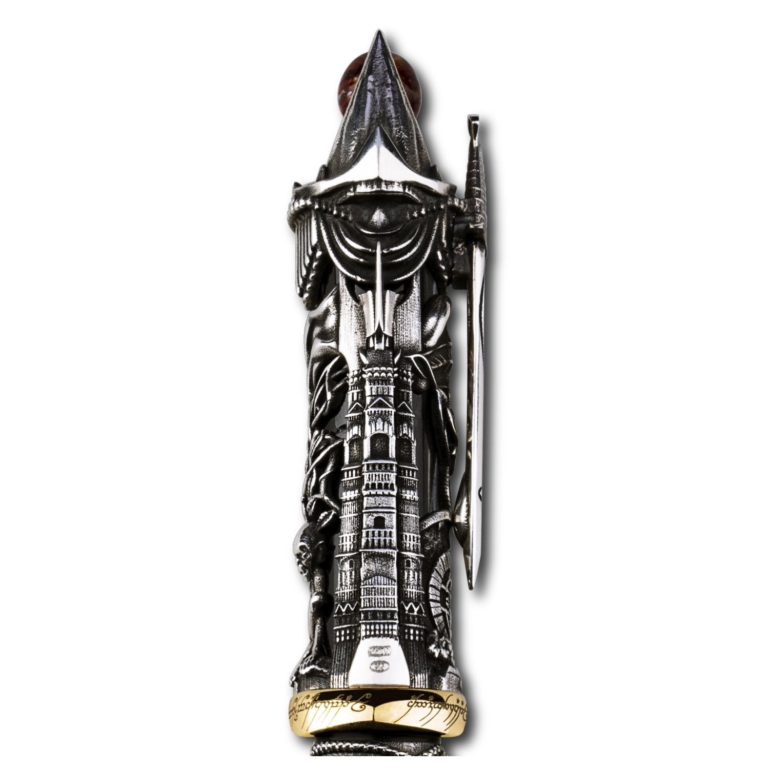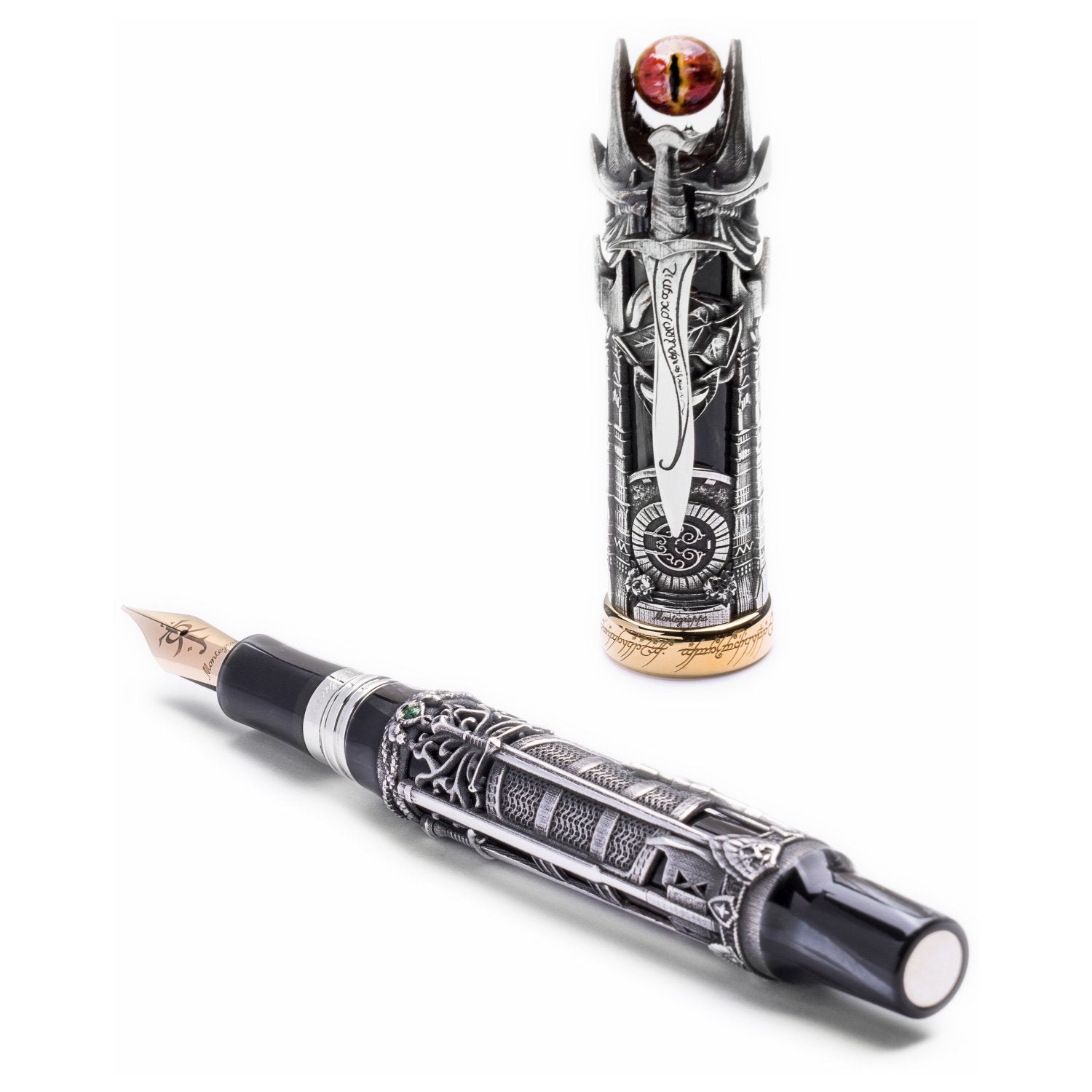 Available in a strictly limited edition of 379 fountain pens and 379 roller ball pens, and presented in a handsome The Lord of the Rings-themed velvet-lined box, the pen is crafted in a combination of celluloid and jewelry-grade .925 Sterling Silver, and all trim is also .925 Sterling Silver. The fountain pen utilizes a piston filling system, and features an 18k gold nib that's available in three widths. Made in Italy, each pen measures 161mm (6.3 in) long and weighs 108 gm (3.8 oz), providing the perfect length and balance for all of your most important journal entries, personal letters, and signatures on key business or family documents.