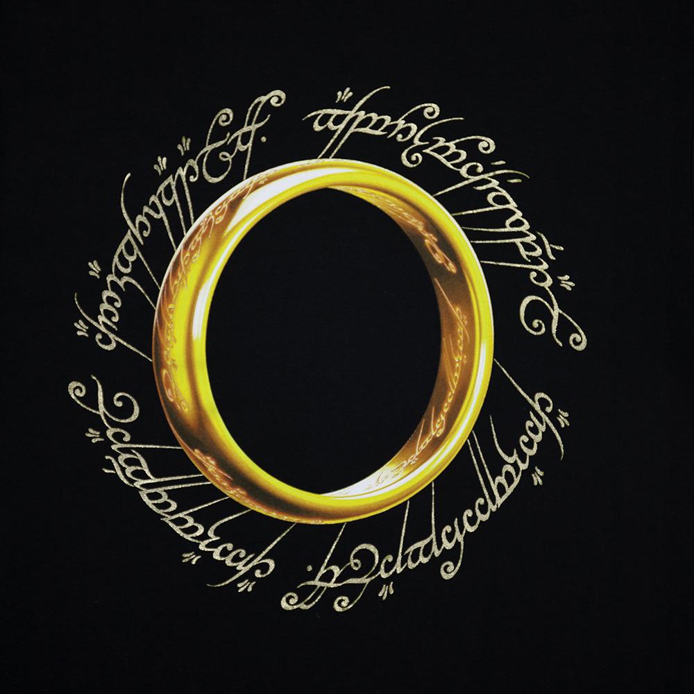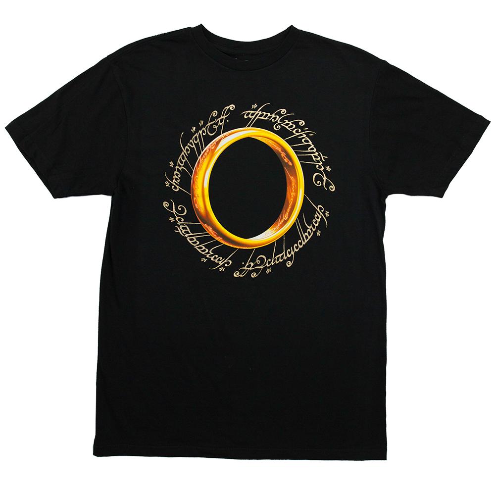 Our exclusive! This t-shirt features the One Ring and the Black Speech of Mordor script from The Lord of the Rings film trilogy printed with a special gold foil treatment, giving it a truly enhanced look and providing extra texture. 100% cotton