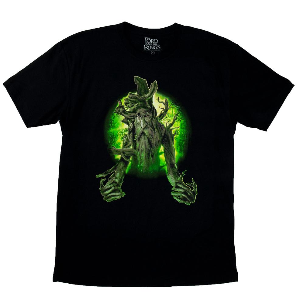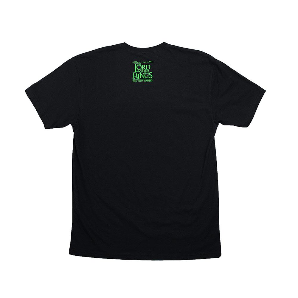 Our exclusive! This t-shirt features Treebeard on the front against a black background. Using a special glow-in-the-dark ink, Treebeard is surrounded by a green mist. This mist flows in the dark, making this a truly unique t-shirt. The back features The Lord of the Rings: The Two Towers 15th anniversary logo. 100% cotton