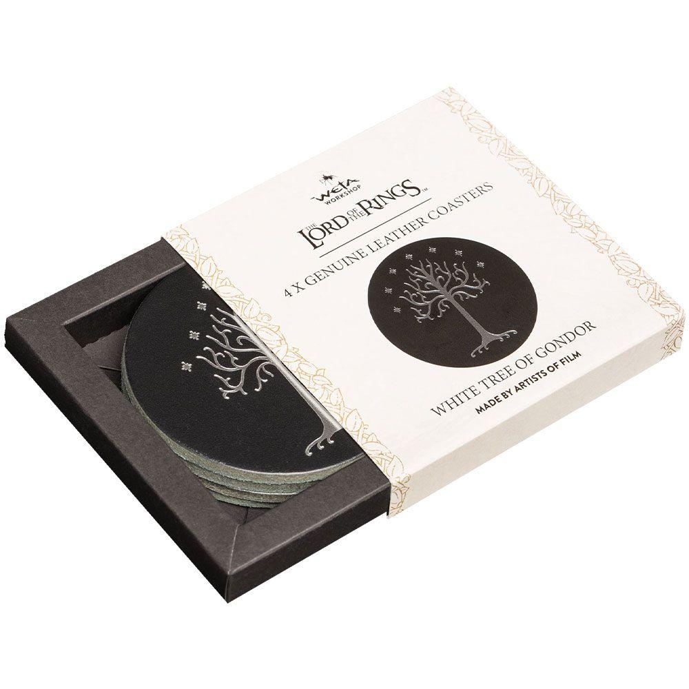 The White Tree Coaster set includes a set of 4 individually detailed coasters inside a beautiful printed presentation box. Made from supple bovine leather with silver gilt detailing, these coasters are a natural product with unique color and texture variations. No two sets are the same!